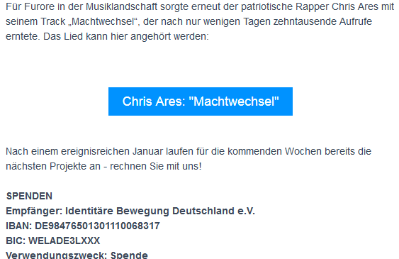Und auch in mehreren seiner Musikvideos zeigt er sich mit der Fahne der Identitären Bewegung oder es werden Videoschnipsel von Aktionen und Demonstrationen der IB abgespielt.