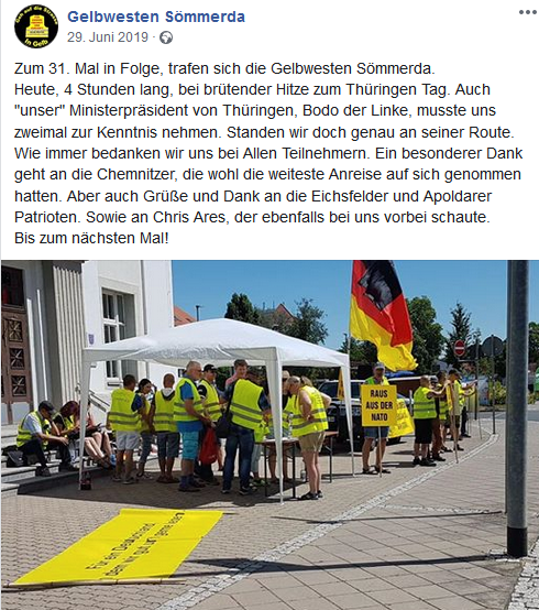 Am 29. Juni 2019 unterstützte er die extrem rechten Initiative Gelbwesten Sömmerda in Thüringen durch seine Anwesenheit. Allerdings ist es zumindest fraglich, ob er tatsächlich nur für diese sehr kleine Kundgebung den weiten Weg nach Thüringen auf sich genommen hat. Die bei seinem dazugehörigen Instagram-Post verwendeten Hashtags „Fügel“ und „Erfurt“ legen einen Kontakt zu Björn Höcke nahe, den er bereits im Mai 2016 in Erfurt traf. Möglicherweise war er aber in Thüringen auch auf der Suche nach Kontakten für sein Dorf-Projekt.